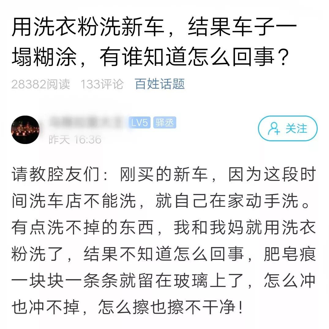 网友留言 ☞天边一朵云:洗车不能用洗衣服,最好是快过期的洗发水洗车不会有痕迹。 ☞敛财:洗衣粉去污能力强,把车漆表面的蜡洗坏了啊!再打一下蜡就好了。 ☞多多他爸:高压水枪冲洗。 ☞马小小小超:洗衣服洗洁精之类的都是不能拿来洗车的。 ☞junk:洗衣粉是碱性的,会和油漆反应。 洗衣粉洗车危害