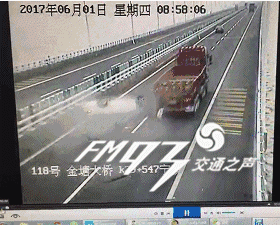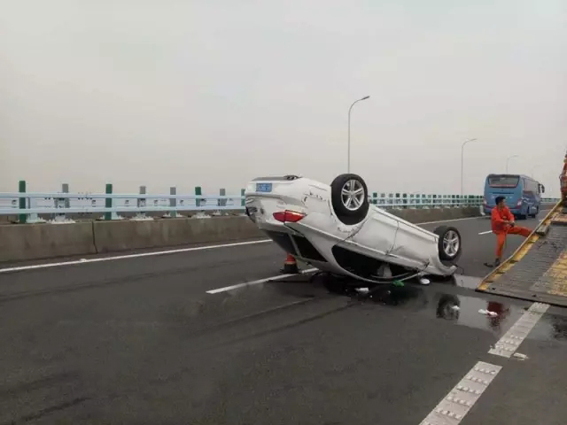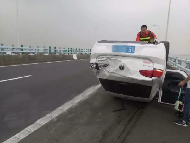 6月1日08时58分,舟山跨海大桥29km+400m处一辆浙E号牌的白色大众车与一辆浙B号牌重型牵引车发生了侧面相撞,导致小轿车直接四轮朝天并往前滑行了50多米。
