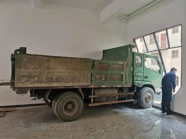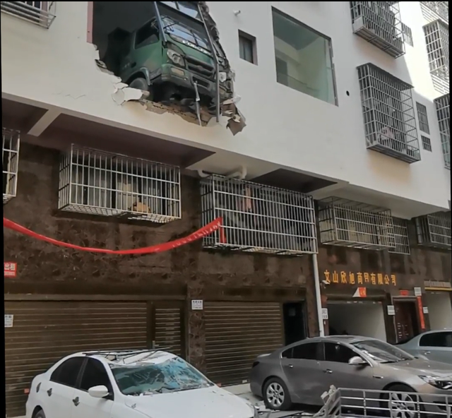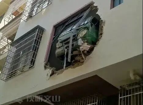 下午两点多,当记者来到现场时,只见一辆大卡车从二楼穿墙欲出,险些从二楼掉下来,原本窗户上的防盗笼都被全部撞到了一楼。货车的车门上印有“马关县车辆运输公司”的字样。