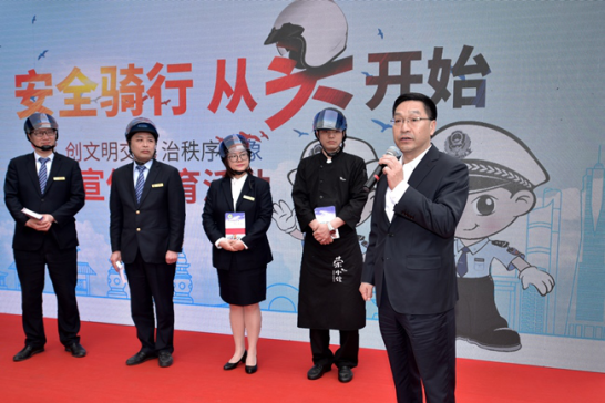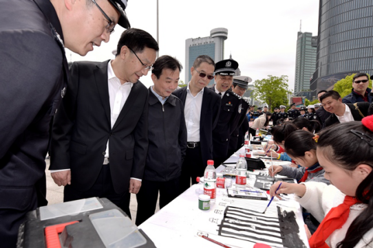 4月27日上午,副省长、公安厅长王双全出席了省厅在杭州大厦举行“一创一治”新闻发布——“安全骑行,从头做起”广场宣传活动。王双全副省长听取了杭州市局有关社会综合治理的图解汇报,并给杭州大厦员工示范如何正确佩戴头盔、赠送《电动自行车安全教育读本》,还对群众安全出行提出殷切的希望。