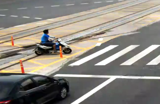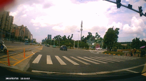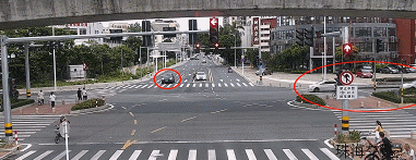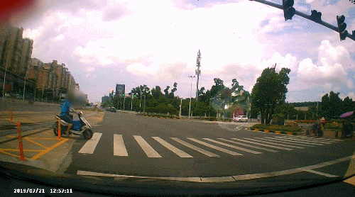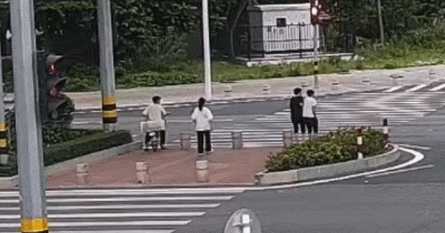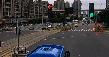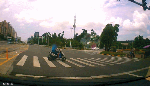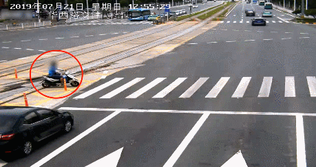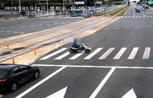 路口的监控视频显示,中午12点55分,小马驾驶摩托车来到梅华路交健民路路口等待,想从斑马线通过路口,此时人行横道是红灯。▼