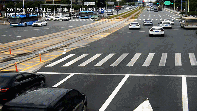 到了健民路路口,前方绿灯快结束了,李女士打算趁绿灯冲过路口。小马此时也来到路口,在有轨电车轨道旁的黄方格内等候,想伺机沿斑马线通过路口。▼