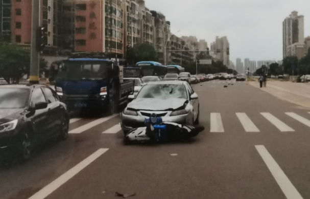 伴随着一声巨响,小马砸上挡风玻璃抛到空中,身体转了几圈,从车后摔落地面。马自达小车推着摩托车一直滑行50多米,到路口尽头处才停了下来。▼小马蜷曲着身子不省人事,头部流血不止,衣服、鞋子、盒饭洒落一地。马自达小车的挡风玻璃碎成蜘蛛网状,摇摇欲坠,车前盖严重变形。带有血迹的轮胎印从斑马线开始延伸向路口。▼树上的知了安静了片刻,又开始了“吱吱”鸣叫。正午的太阳,还在毒辣辣地炙烤着大地。李女士只觉脑袋一片空白,她机械地打报警电话,叫救护车,安慰车内的儿子,然后打电话叫家里人赶紧过来,把儿子先接走。小马被抬上救护车送往人民医院抢救,香洲交警则对现场进行仔细勘查。有路人把事故照片发到朋友圈,恰好被“饿了么”员工彭某看见。▼彭某一眼认出受伤的小马,他想赶到现场,又怕扑个空,于是赶紧联系交警了解情况,然后赶往人民医院。
