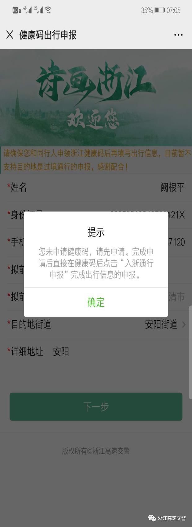 或通过支付宝搜索关注“浙江高速交警“生活号,进入到“健康码出行申报”界面后按提示操作。