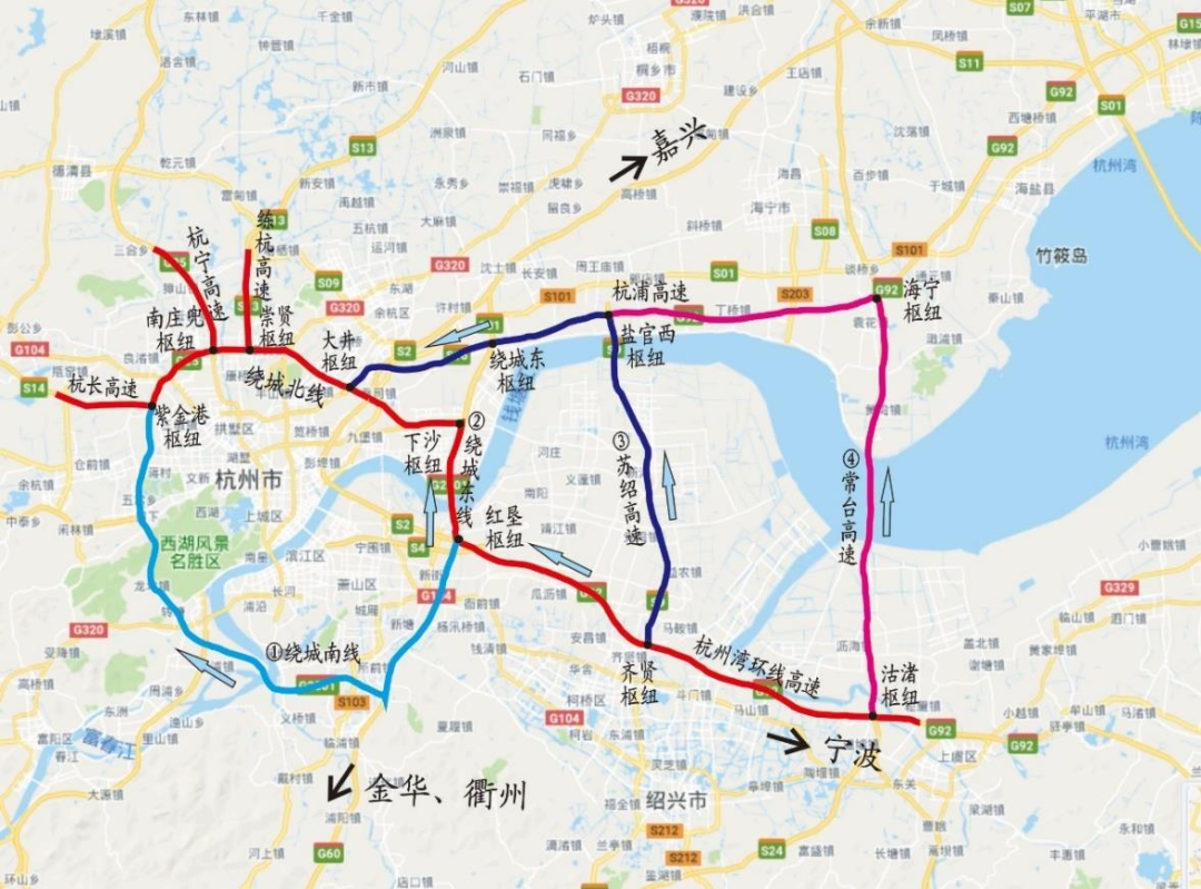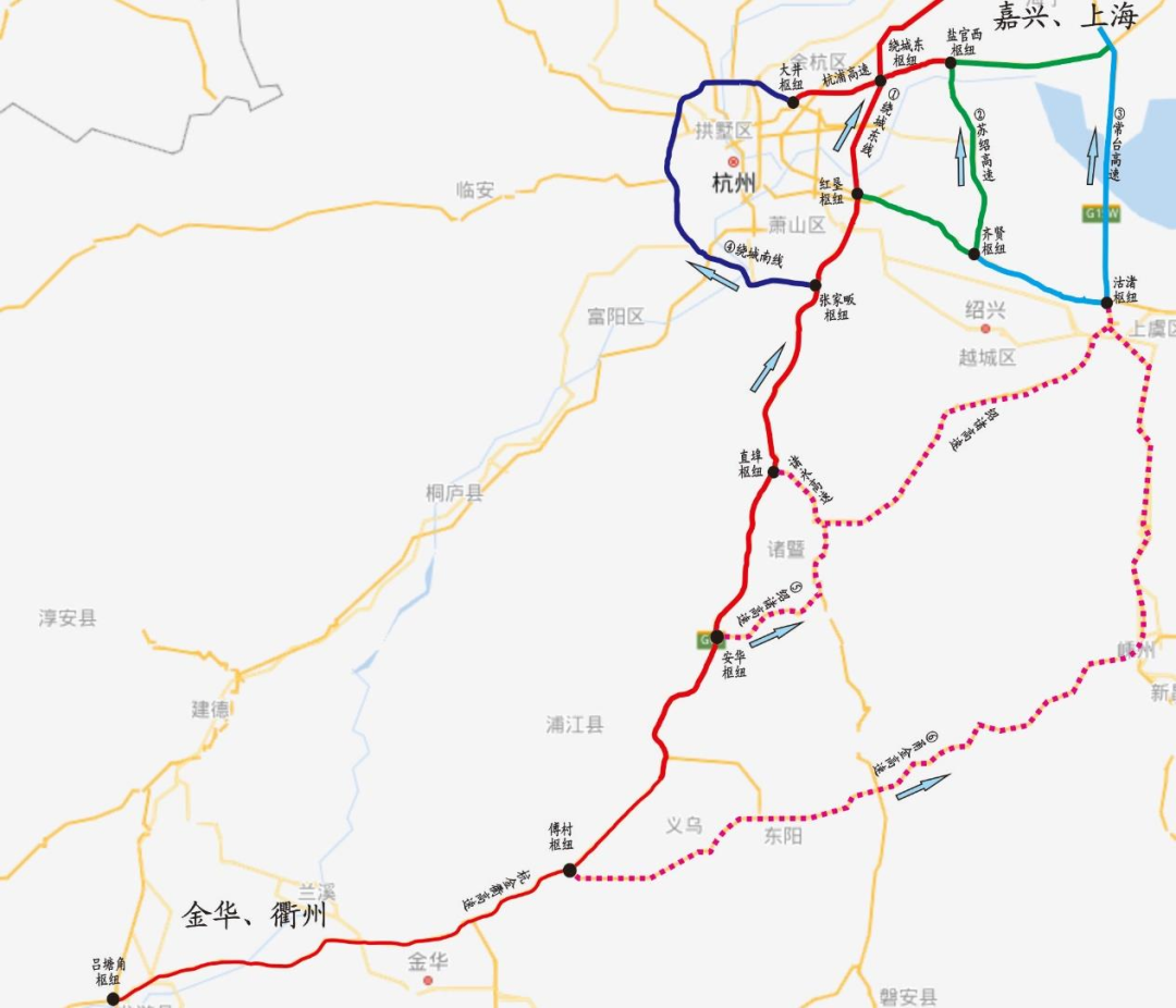 ①金华、衢州——绕城东线——沪杭(杭浦)——嘉兴、上海②金华、衢州——杭金衢高速——杭州湾环线高速——钱江通道——杭③金华、衢州——杭金衢高速——杭州湾环线高速——常台高速——嘉④金华、衢州——绕城南线、北线——杭浦高速——嘉兴、上海⑤金华、衢州——杭金衢高速——绍诸高速延伸线(诸永高速)——常⑥金华、衢州——杭金衢高速——甬金高速——常台高速——嘉兴、上海(远端分流)