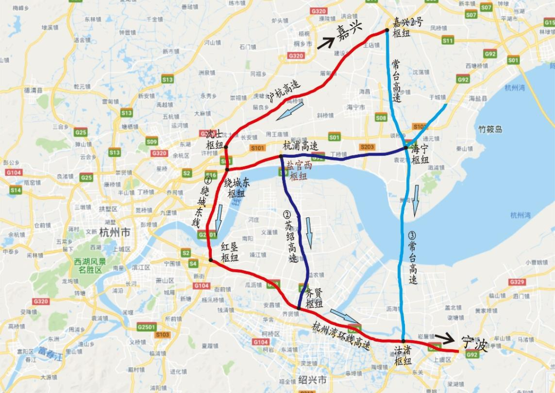 (3)从嘉兴、上海(沪杭、杭浦高速)往绍兴、宁波方向货车车辆①嘉兴、上海——沪杭——绕城东线——杭州湾环线高速——绍兴、宁波②嘉兴、上海——沪杭——杭浦——钱江通道——绍兴、宁波③嘉兴、上海——常台高速——绍兴、宁波