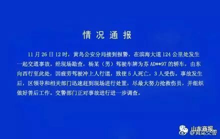 昨天12时,山东黄岛公安分局接到报警,在滨海大道124公里处发生一起交通事故。经现场勘查,杨某(男)驾驶车牌为苏AD**97的轿车,由东向西行至此处,因疲劳驾驶冲上人行道,致使5人死亡,3人受伤。