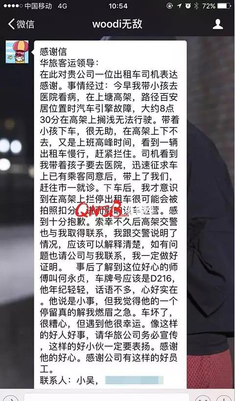 面对何师傅的热心帮助,小吴十分感动,事后还打电话向交警同志说明了原因,今天一早,又通过出租集团热线电话,向热线工作人员说明情况,并用微信发来一封感谢信。