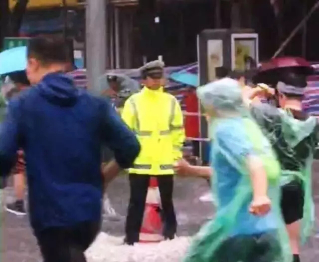 在暴雨中,三名交警在窨井盖上一站就是两个多小时,直到所有选手全部通过这个路段。