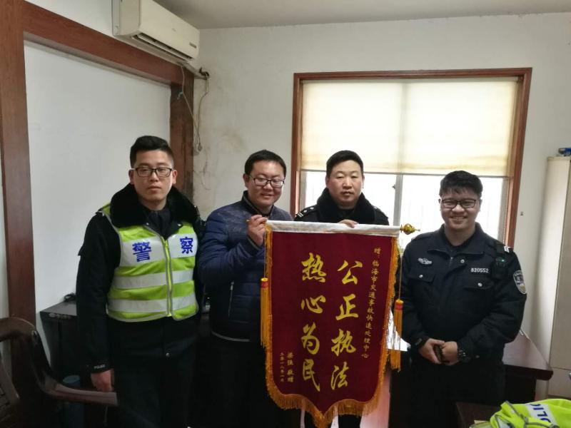 1月25日,来自江西省贵溪市在临海市创业的梁某夫妇,特地来到临海市交警大队,向临海交警李昕、徐一期等赠送了一面印有“公正执法、热心为民”的锦旗,感谢临海交警用真实的行动,解除了他们作为外地人那种本能的担忧和防范,在无助的时候给予关怀和法律知识援助,让他俩在不是家乡的临海找到了“家”一样的温暖。