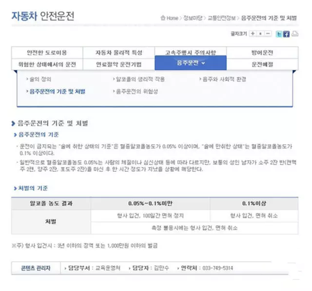 记者在韩国道路交通公团网站上看到,韩国的酒驾标准也分为两级,检测出的血液酒精浓度达到0.05%以上是“醉酒状态”,酒精浓度超过0.1%属于“烂醉状态”,相当于普通成年男性饮用2杯半烧酒(或2听啤酒,2杯洋酒,2杯葡萄酒)一小时以后的状态。